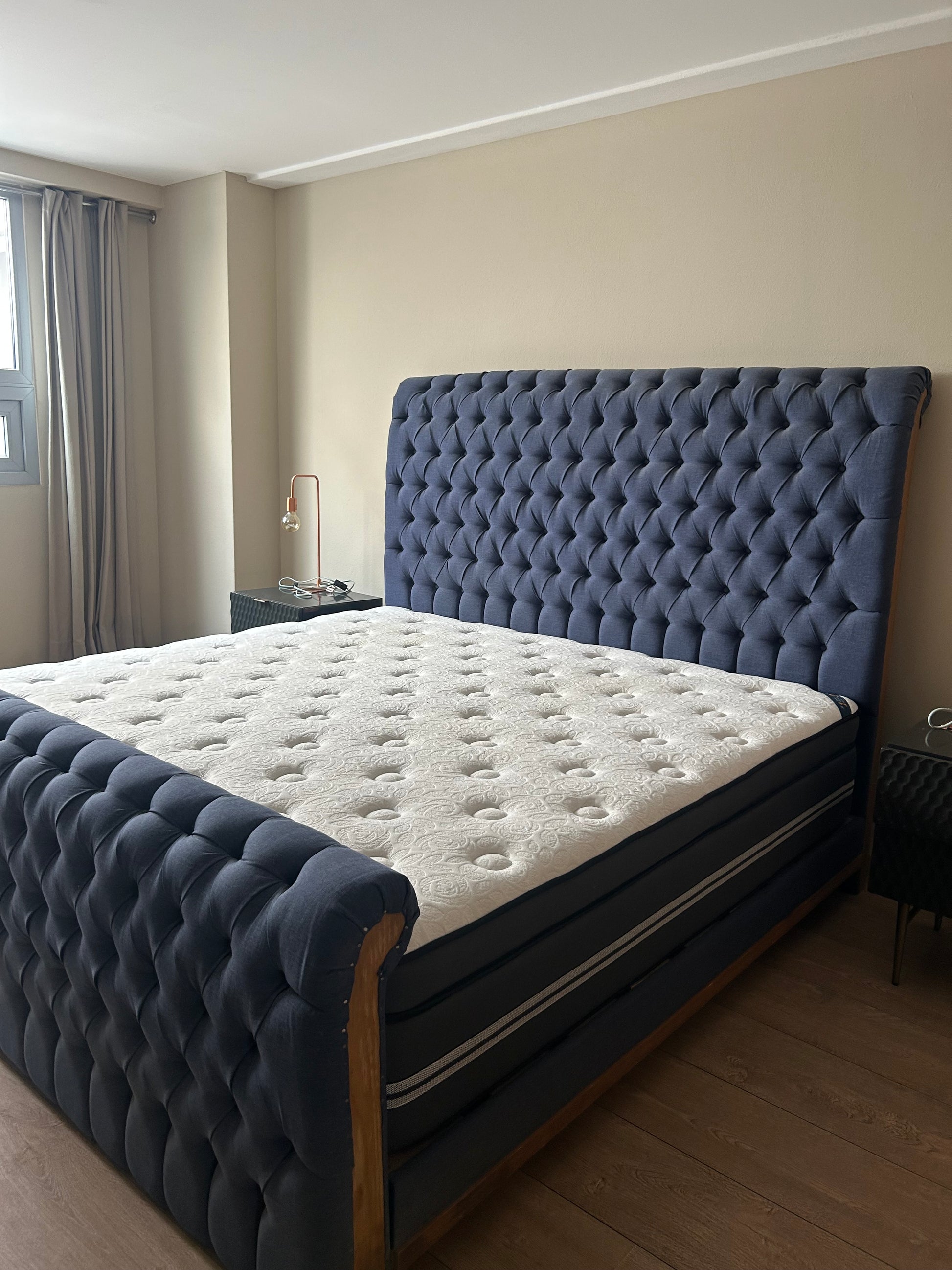 Notas del Vendedor:Base cama tamaño king (sin colchón), con cabecera y piecera capitonadas en tela azul marino y estructura de madera.