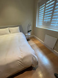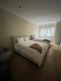 Notas del Vendedor:Cama Paula de diseño atemporal confeccionada en tela española de primera calidad, mezcla de algodón y lino con base de madera de encino. Incluye 1 cabecera y 1 base de cama
