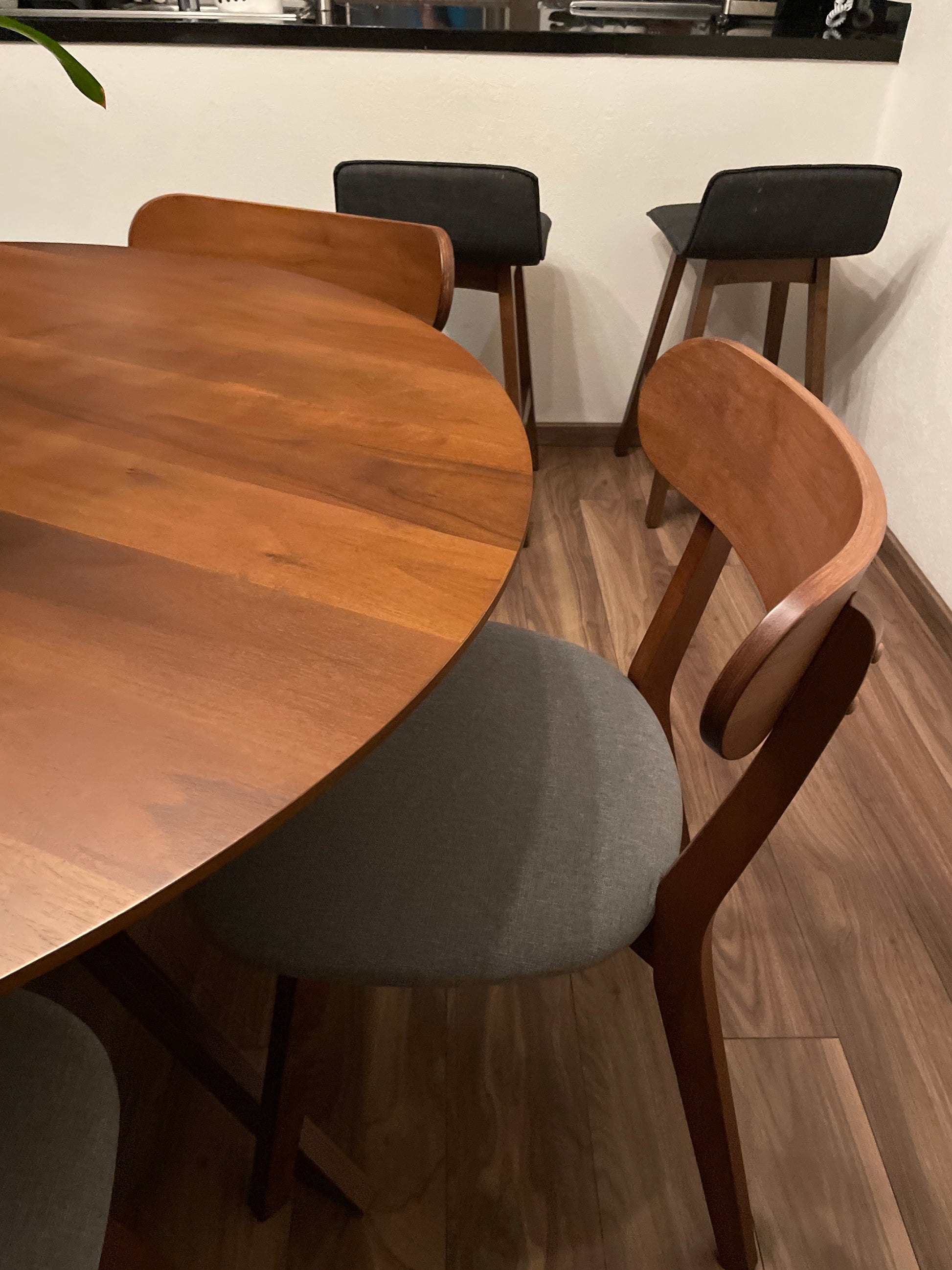 Notas del Vendedor:Comedor circular con 5 sillas de madera, solo usado por dos años muy espodaridamente, se tiene más de decoración. Se vende por cambio de casa Cantidad en el set: 1