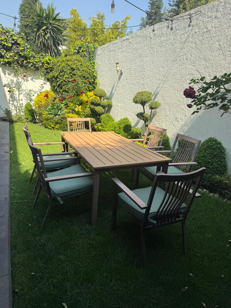 Notas del Vendedor:Hermosa mesa de jardín con estructura metálica, 6 sillas con cojines, sombrilla y base. Materiales de alta calidad, muy resistente al sol y la lluvia.