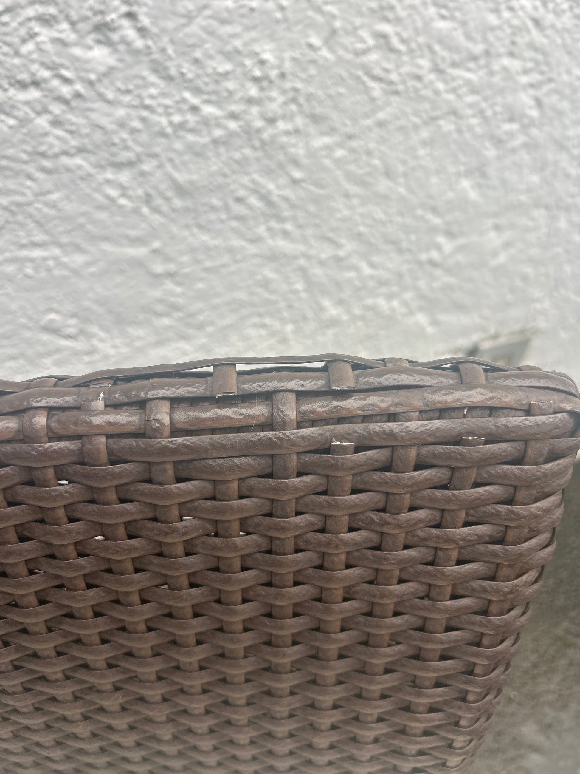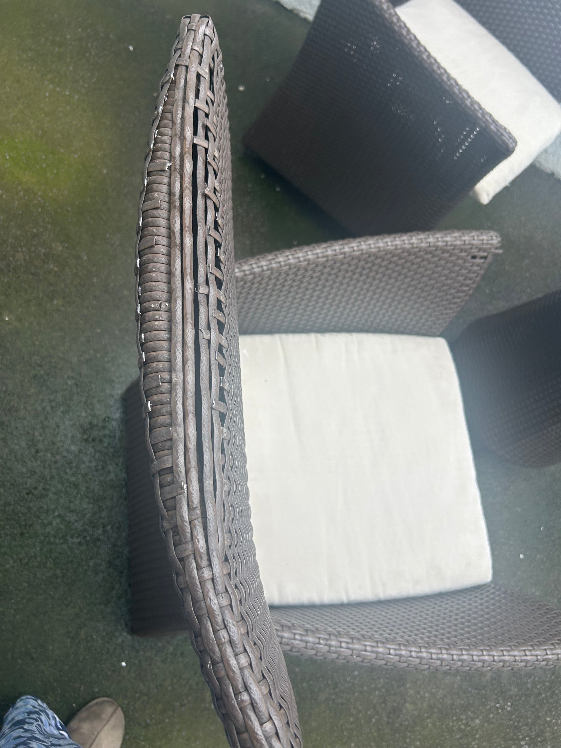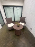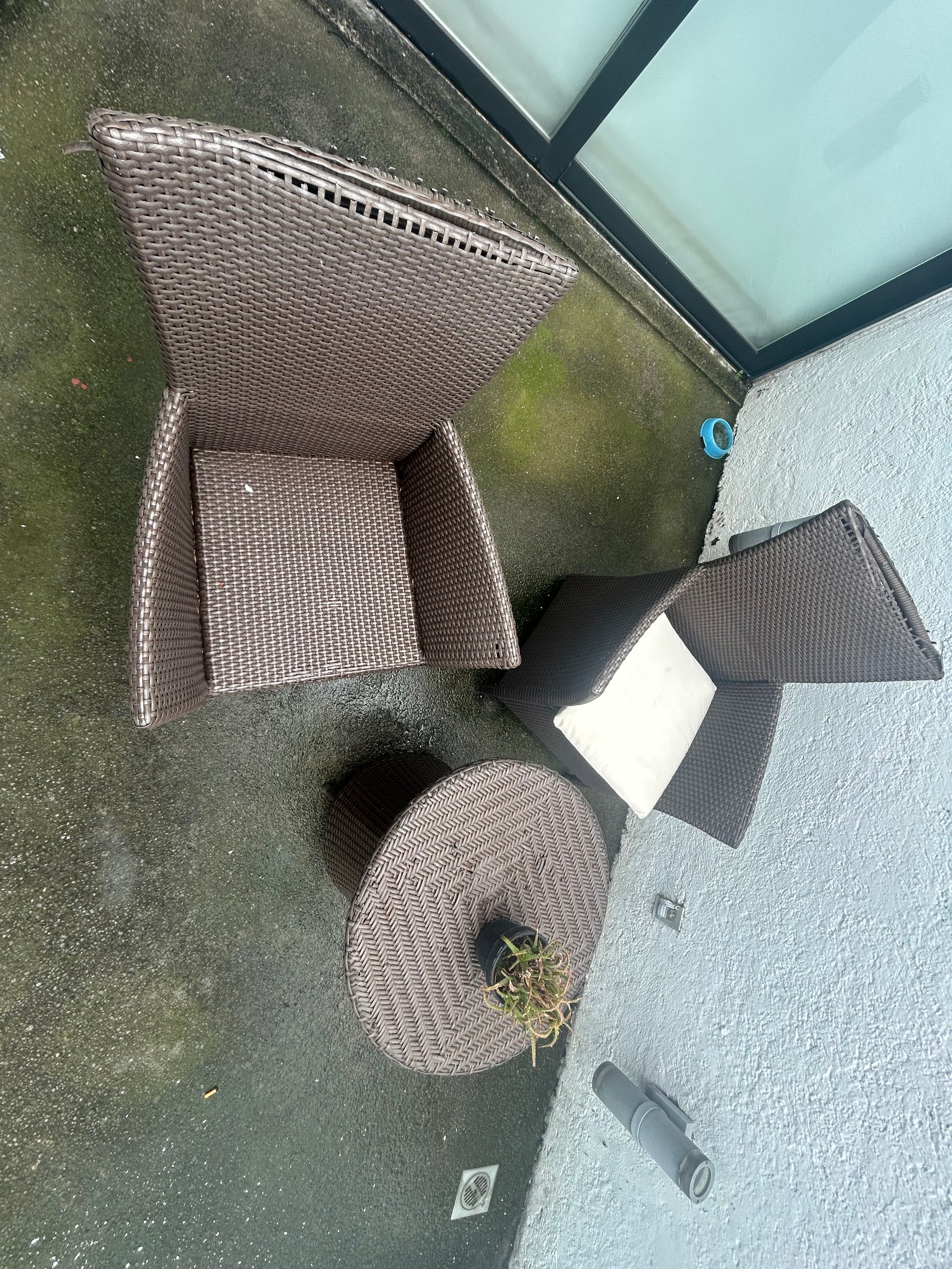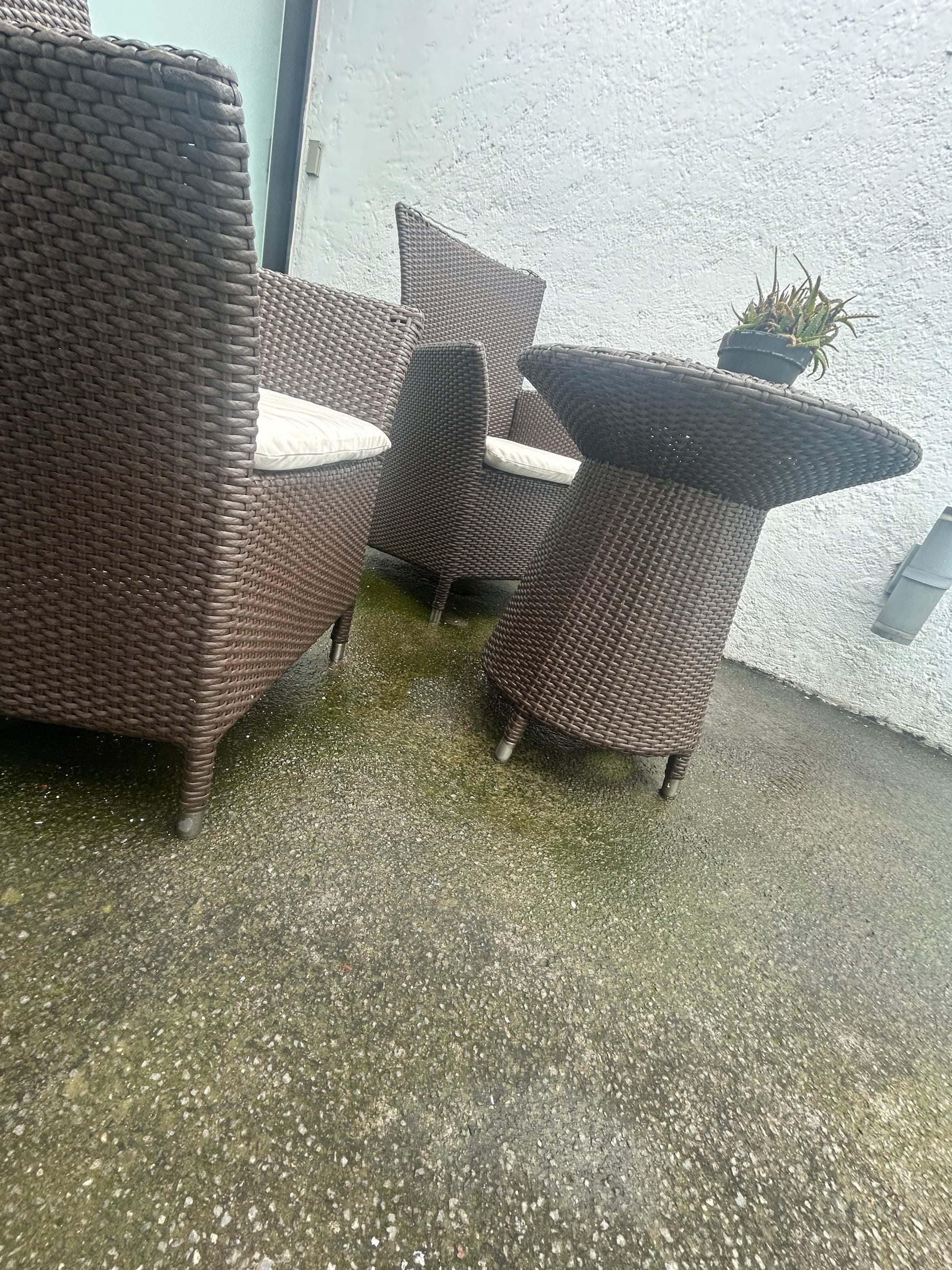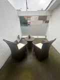 Notas del Vendedor:Conjunto de mesa y dos sillas ideal para terraza, balcón o jardín. Fabricado en plástico resistente con acabado tejido tipo ratán en color café, fácil de limpiar y ligero para mover. Perfecto para disfrutar de un café, leer o relajarte al aire libre. En buen estado y listo para usar.